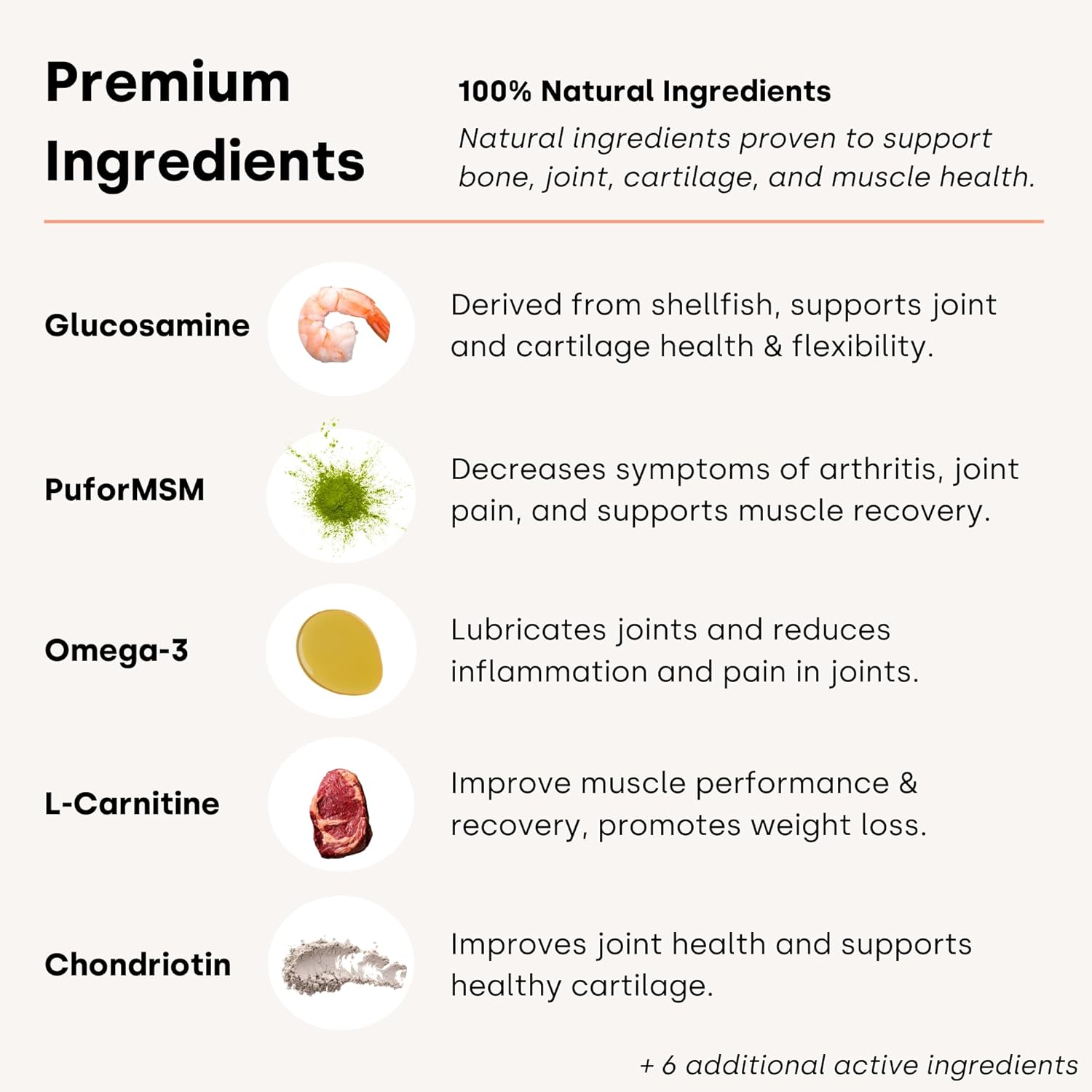 - Active Ingredients : Glucosamine, Chondroiting, Omega 3, MSM, L-Carnitine